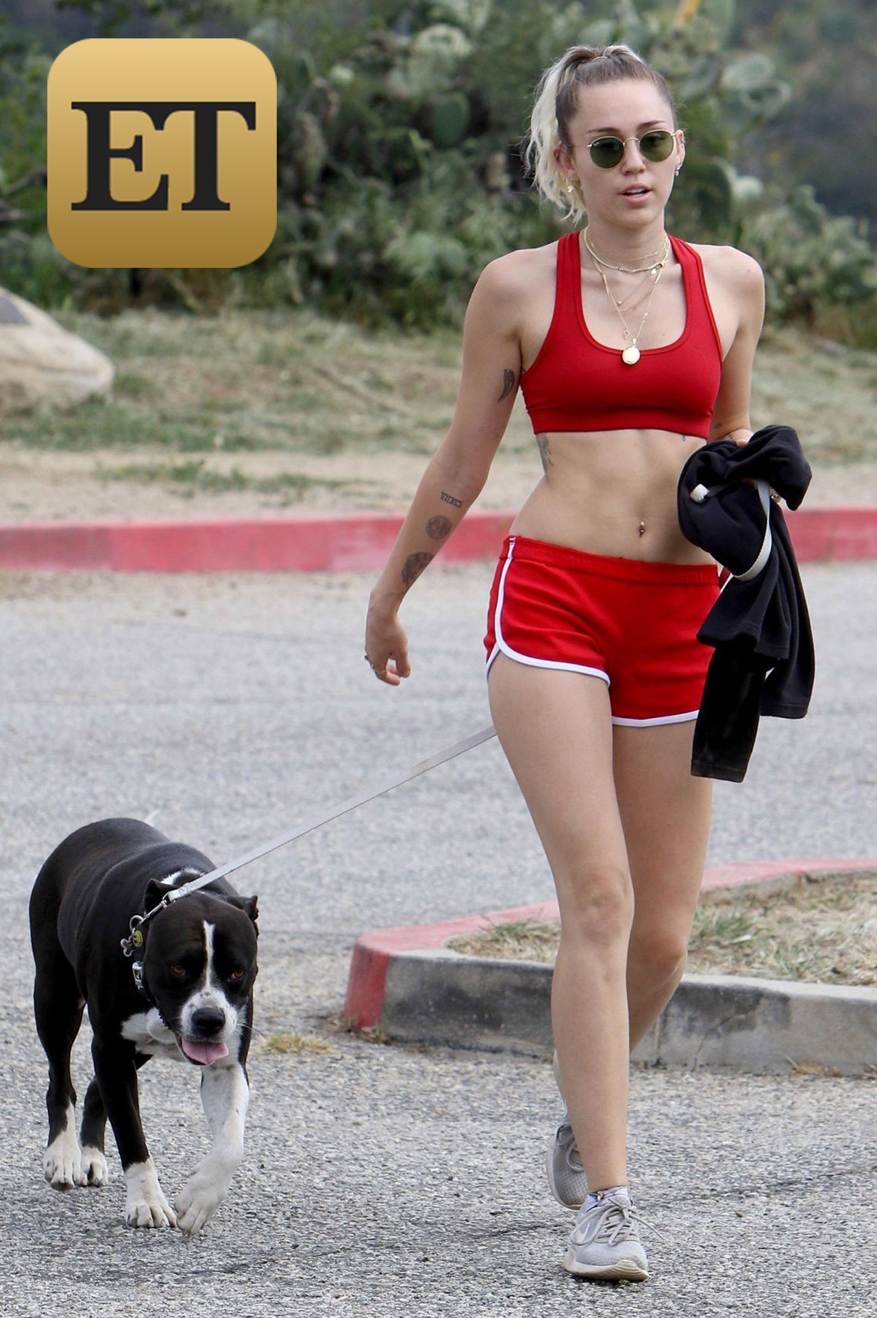 Cyrus appeared ready to work up a sweat, flaunting her rock-hard abs in a bright red sports bra and matching short-shorts. The 24-year-old singer shaded her eyes from the sun with round-framed sunnies, and kept her platinum blond locks slicked back into a tight ponytail.