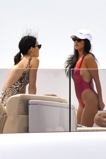 The mother of three was spotted on a yacht wearing a high-cut Baywatch-inspired red swimsuit that she paired with dark sunglasses and a white dad hat. As for her younger sibling, Kendall rocked a sexy leopard-print one-piece and cat-eye sunglasses. The sisters later hopped off the yacht and hit the waves on a jet ski, with the 21-year-old model in the driver's seat.
