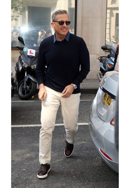 Steve Carell is looking a lot more dapper than he did during his days on The Office and his fans are taking notice. While promoting Despicable Me 3 with co-star Kristen Wiig, the 54-year-old actor turned heads last week when he stepped out in London, England, wearing stylish shades, a fitted blue sweater, khaki pants and trendy leather sneakers.