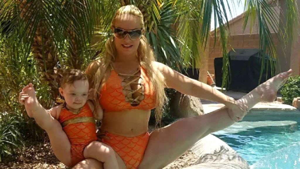 On Tuesday, the 38-year-old model and her little girl hit the pool to "beat the heat" in Arizona and, once again, color coordinated their swimsuits. Chanel wore an orange-and-gold Sugar Dollz one-piece, while her mother rocked a sexy bikini with the same print.