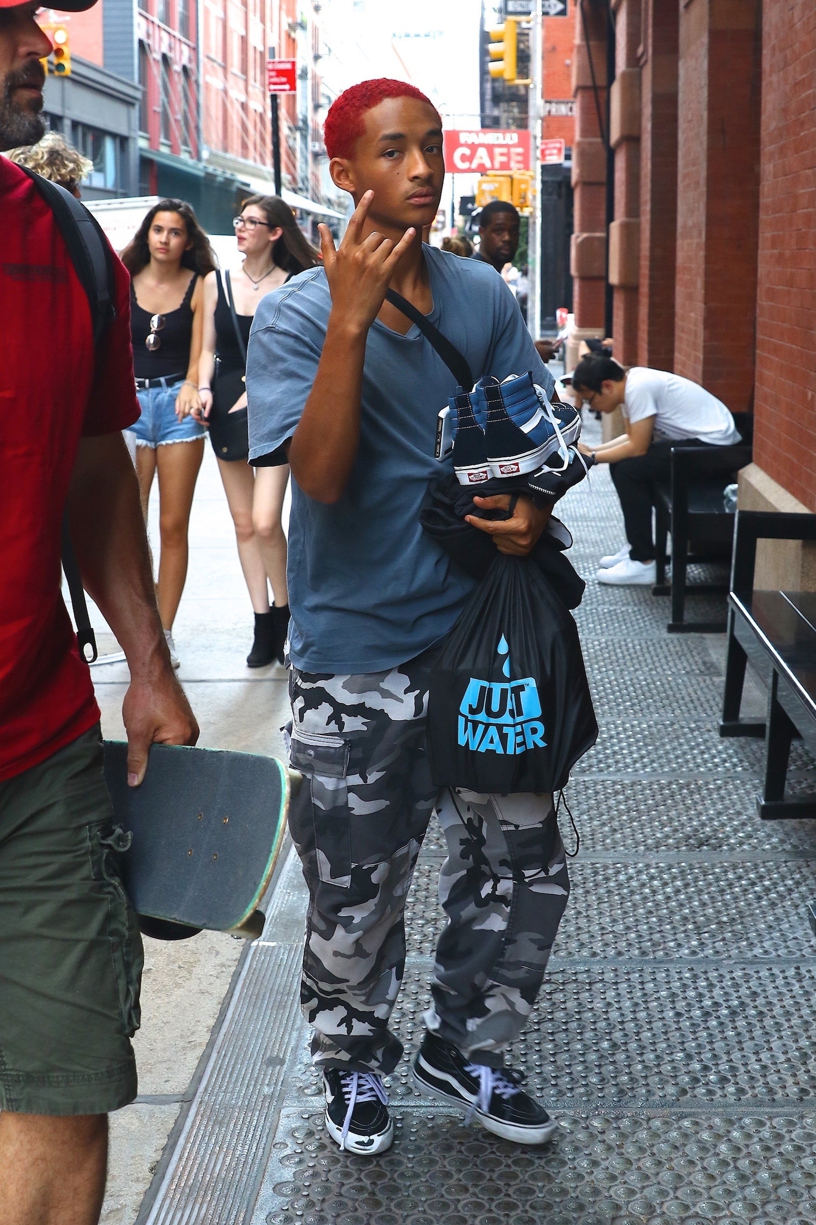 Dressed in gray camo pants, vans and a greyish-blue tee, Smith had his hands full as he made an "I love you" sign to the camera and headed inside his hotel.