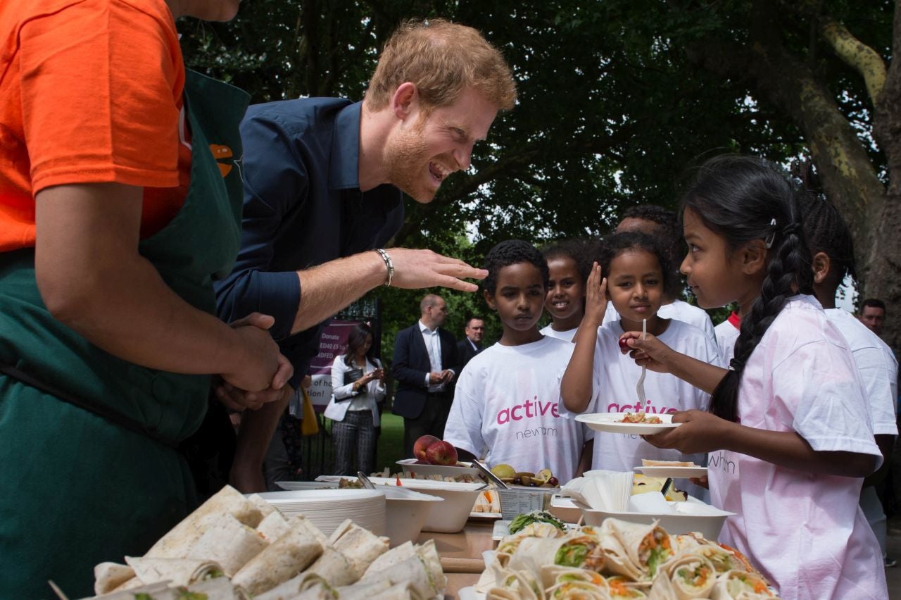 Following a game of handball, Harry made his way over to the food station to help volunteers distribute healthy lunches to the children.