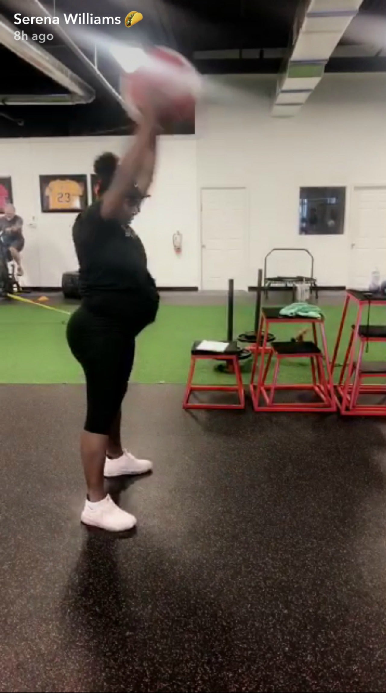 Williams flaunted her burgeoning belly in a form fitting black T-shirt, leggings and white sneakers as she threw down a medicine ball before moving on to "the turtle."