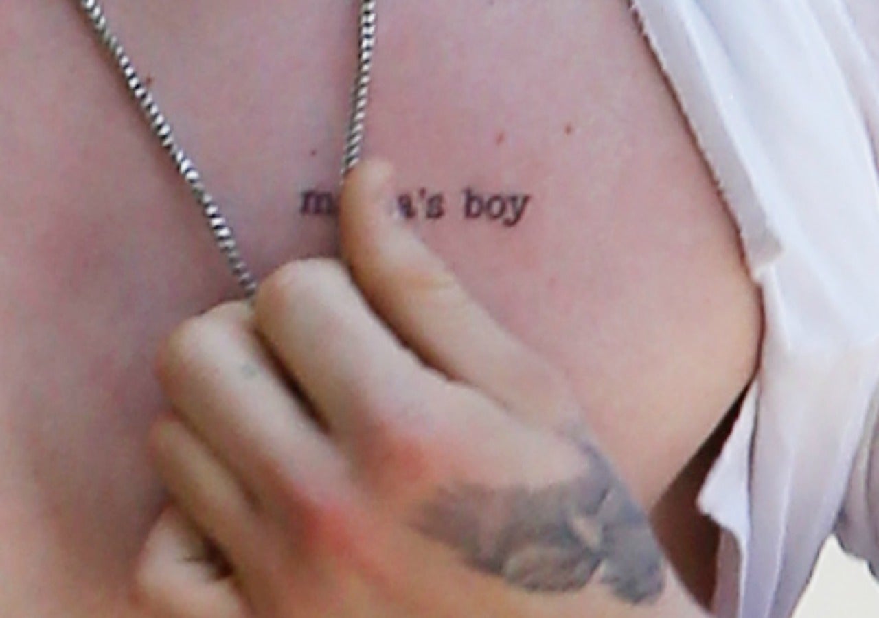 The 18-year-old photographer showed off his newest tattoo -- the words "mama's boy" on his chest -- while jogging in Los Angeles with his friend, Cody Simpson, on Saturday.