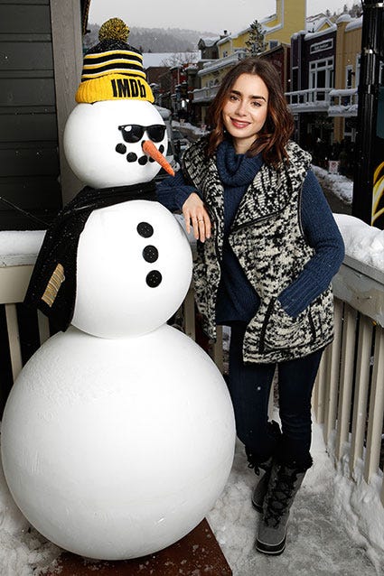 The actress, who was at Sundance for the premiere of her new film, To the Bone, posed with a snowman on the balcony of the Filmmaker Discovery Lounge during the IMDb Studio event on Jan. 21.