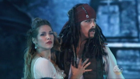 The contestants were asked to re-do one of their dances from earlier in the season, and Riker chose to once again take on the persona of Captain Jack Sparrow from Pirates of the Caribbean, just like he did on DWTS’ Disney night. Only this time, he blew the judges away and got perfect scores across the board. Len even stood and applauded!