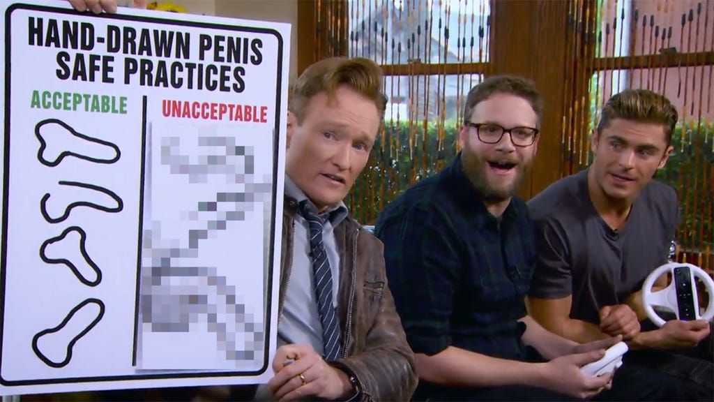 After O’Brien established “his street cred” with a keg of green tea kombucha and a vape pen, the hilarious trio started to play. The late-night host actually won the first round -- and asked Efron to sketch a practices-vetted phallus on Rogen’s arm -- but after that, things took a turn.