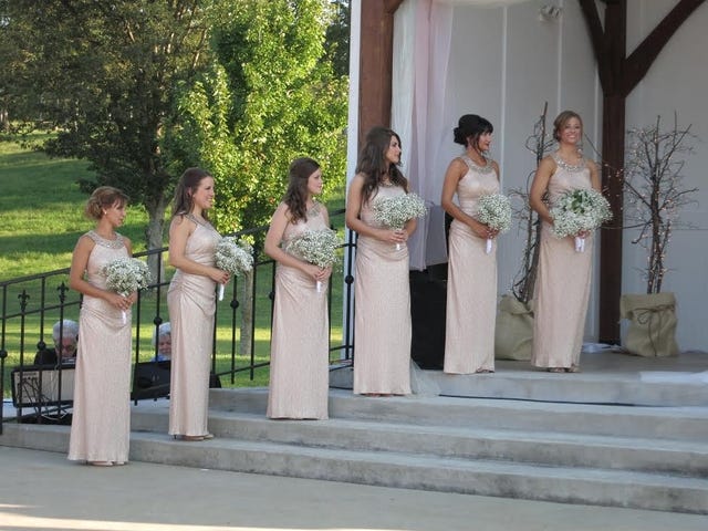 The six bridesmaids (which included close friends and Amy's now sister-in-law, Loren) donned full-length, rose-gold dresses with jeweled collars.