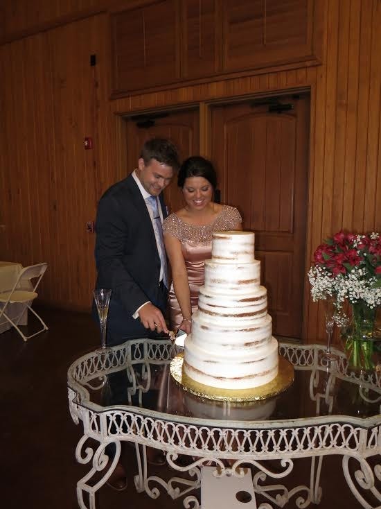 Amy and Dillon cut into the cake together for the first slice out of the five-tier dessert.