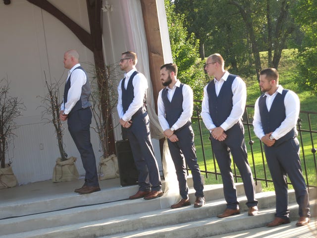 The strapping young groomsmen wore brown shoes with matching vests and slacks.