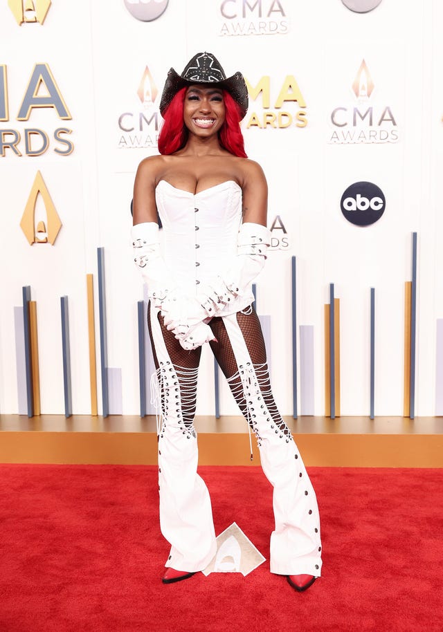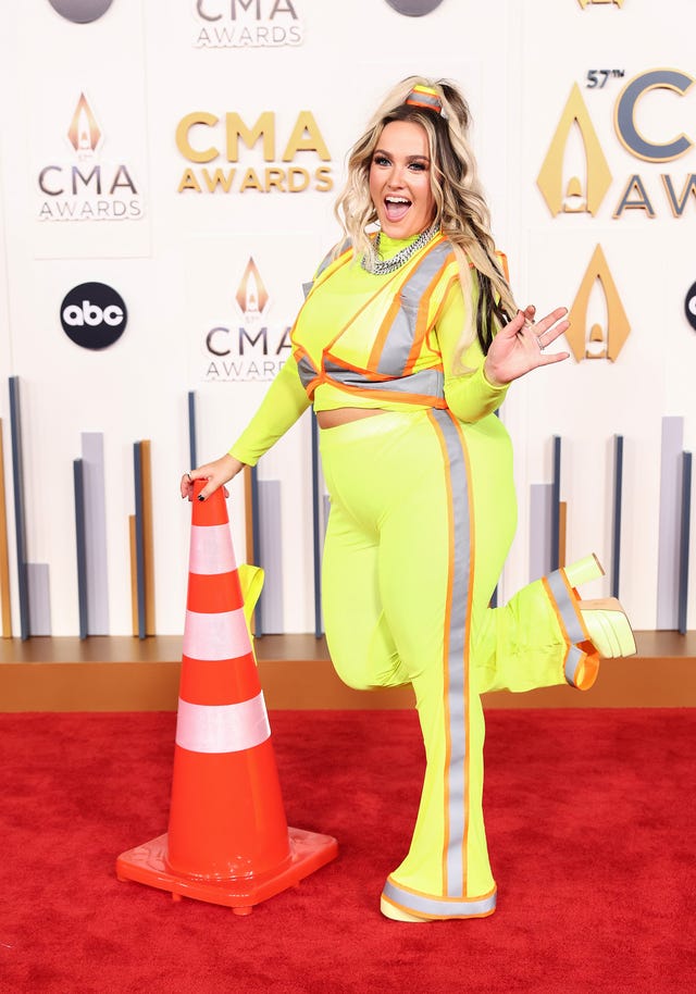 Priscilla Block makes a fashion statement at the 57th annual CMA Awards in Nashville, Tennessee, on Nov 8.