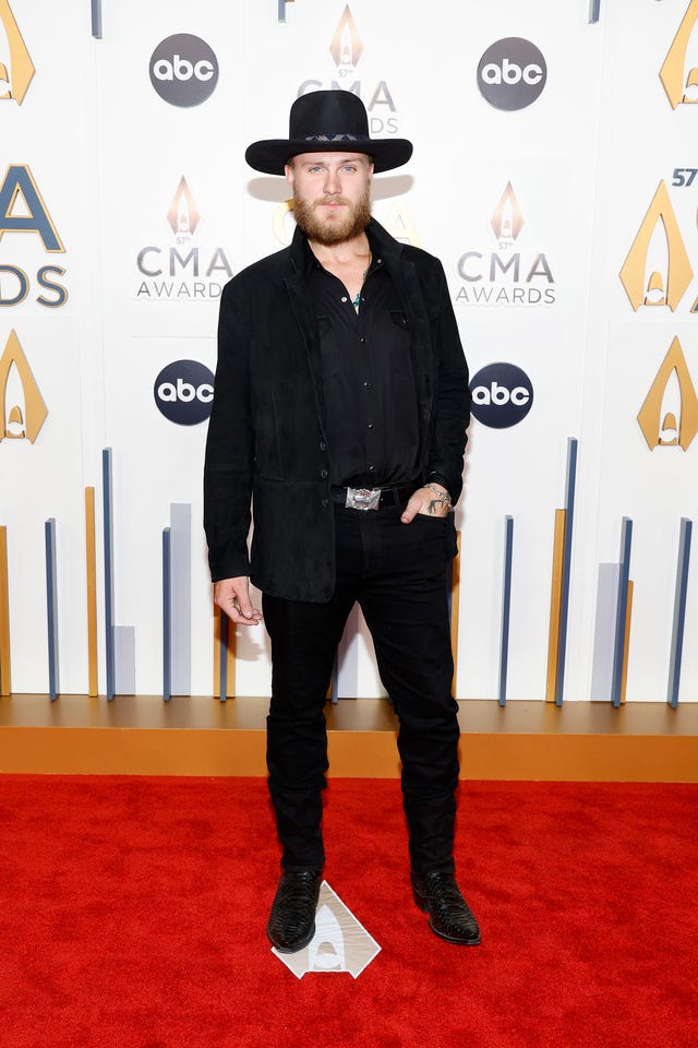 The country artist dresses in all black and a cowboy hat for the CMA Awards.