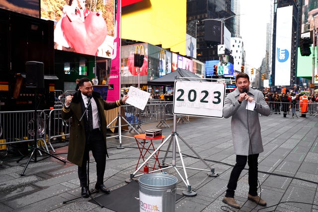 Magician Devonte Rosero and actor Jonathan Bennett perform a magic trick for Good Riddance Day ahead of New Year's Eve on Dec. 28 in New York City.