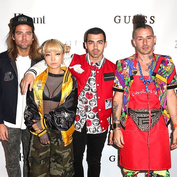 Joe Jonas and his band mates Jack Lawless, JinJoo Lee and Cole Whittle hit up the Flaunt and Guess celebration of the Alternative Facts Issue on April 11 in Los Angeles, California.
