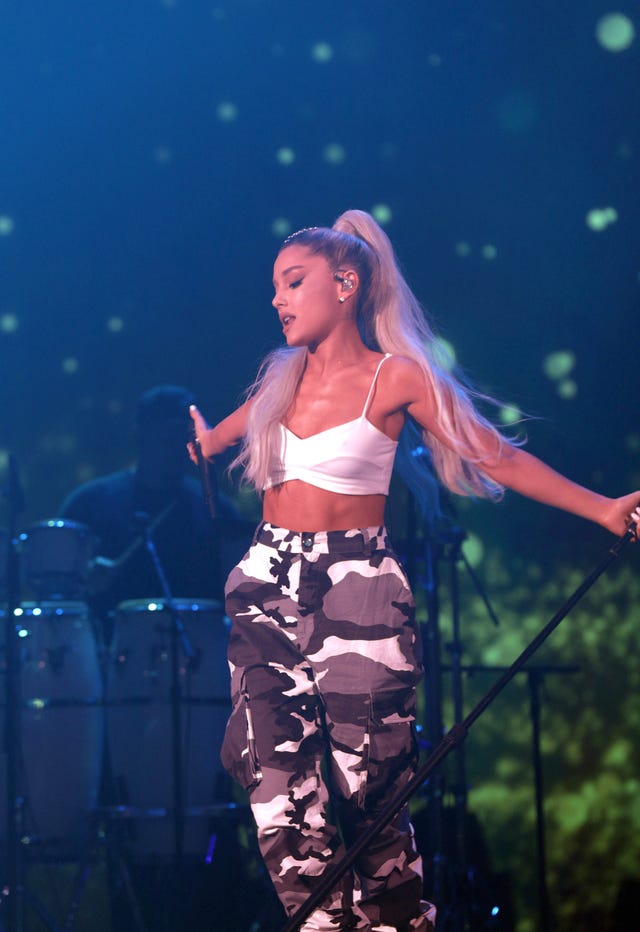 The "No Tears Left to Cry" singer hit the stage during the YouTube Brandcast 2018 presentation at New York City's Radio City Music Hall on May 3 in a tiny white tank top and black-and-white camo cargo pants, plus her signature sky-high ponytail.