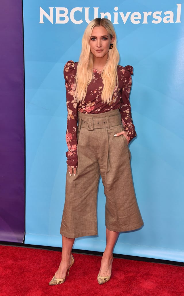 The "Boyfriend" singer teamed a bold-shouldered maroon floral top with khaki-hued belted, high-waisted gauchos and nude-hued patterned heels for the same NBCUniversal Summer Press Day.