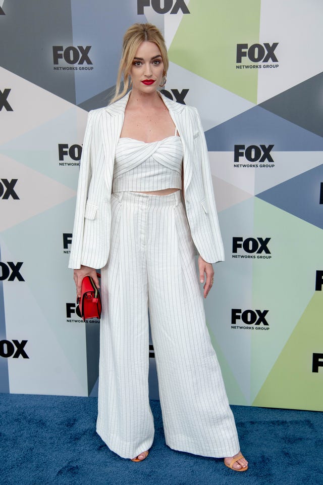 The Passage star looked super chic in this three-piece striped white suit, which included a blazer, crop top and wide-leg trousers, at the 2018 Fox upfronts in New York City's Central Park. She added a pop of color with a bold red lip and purse.