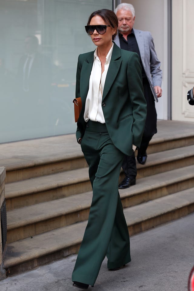 The fashion designer made menswear look oh-so-good when she rocked this hunter green power suit with a white button-down, tan clutch, square sunglasses, platform heels and a long gold necklace while leaving her Dover Street store in London, England.