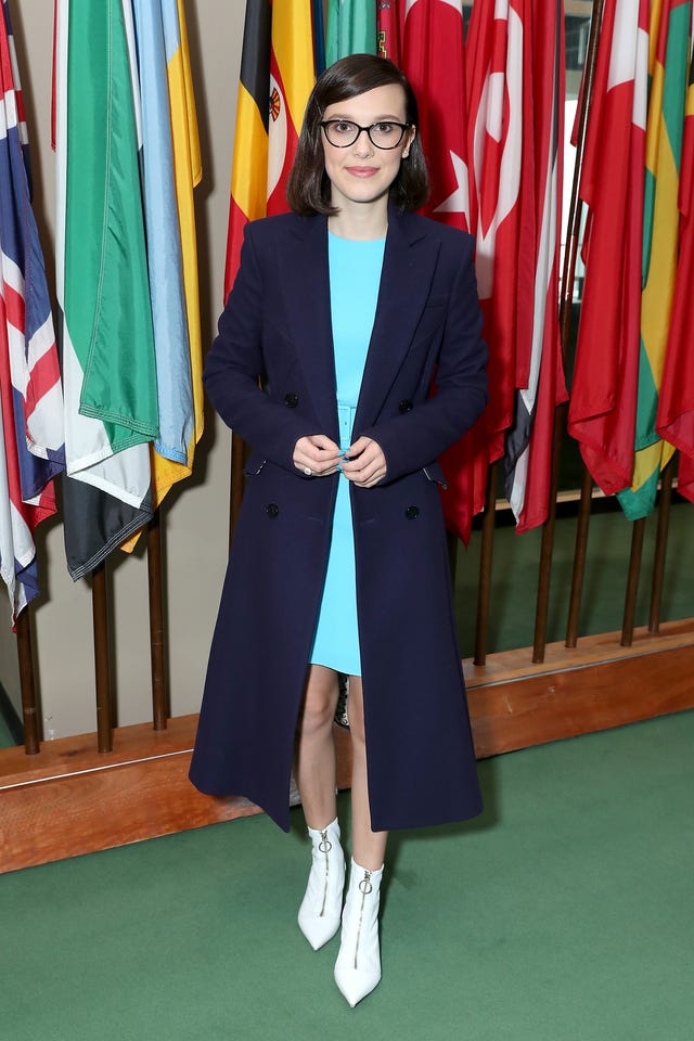 The Stranger Things star was appointed the youngest-ever UNICEF Goodwill Ambassador in New York City. She was youthful yet elegant in a navy blue Altuzarra coat, Emilia Wickstead dress and Tabitha Simmons white boots.