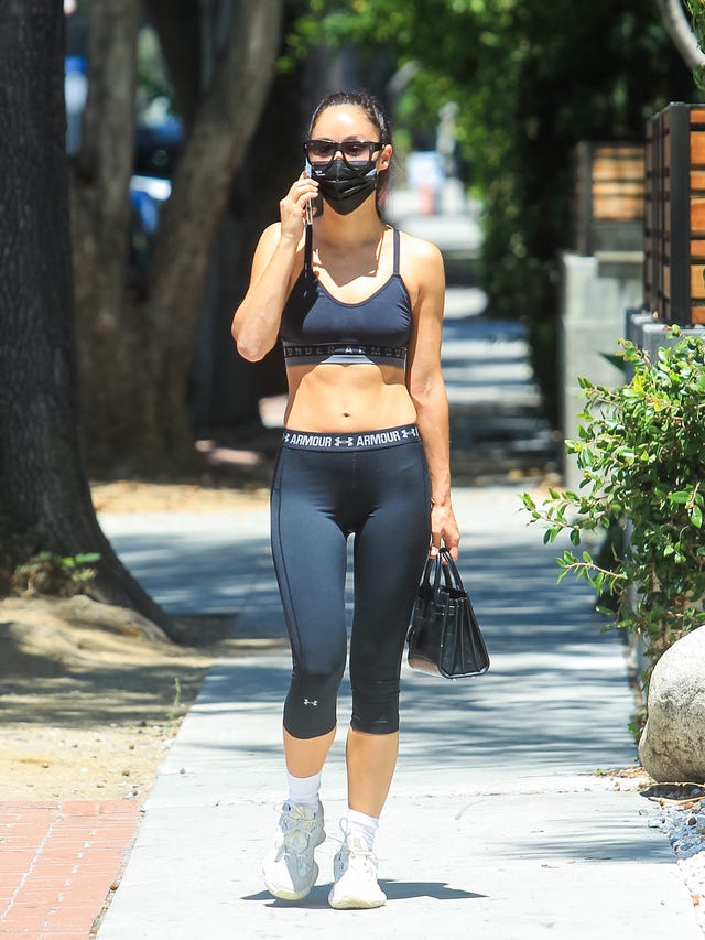 The Vida star showed off her toned tummy in a sports bra and cropped leggings set from Under Armour as she chatted on the phone in L.A.