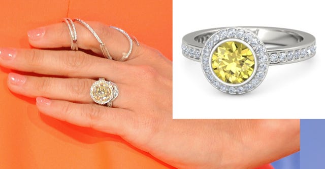 The country singer’s engagement ring features a yellow, round-cut diamond in a halo setting with pavé diamonds along the sides. Gemvara sells a similar ring that features a more affordable yellow sapphire, surrounded by sparkling diamonds.