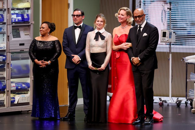 Chandra Wilson, Justin Chambers, Ellen Pompeo, Katherine Heigl and James Pickens Jr. take the stage with a hospital set behind them.