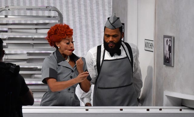 Tracee Ellis Ross and host Anthony Anderson perform an I Love Lucy conveyor belt sketch onstage during the ceremony.