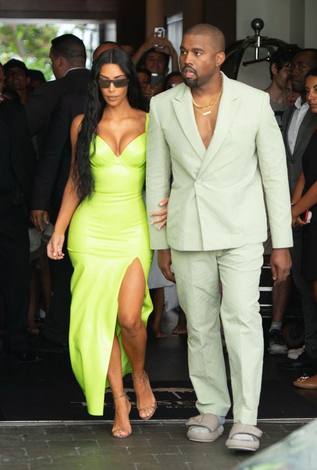 When Kim and Kanye headed down to Miami to attend 2 Chainz's wedding, the hot mama rocked two lime green ensembles within 24 hours, including this latex Atsuko Kudo dress with a deep-V neckline and thigh-high slit, Dior x Rihanna sunglasses and clear sunglasses for the ceremony on Aug. 18.