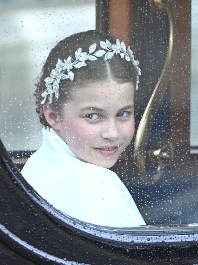 Princess Charlotte smiles in the carriage as her family leaves the coronation ceremony on May 6 in London, England.