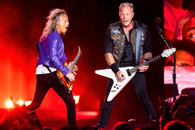 Hard rock musicians Kirk Hammett and James Hetfield of Metallica perform on Day 1 of Lollapalooza on July 28.
