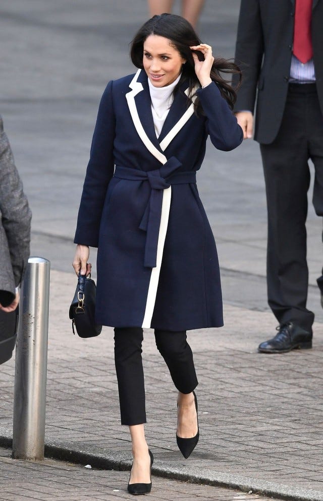 On March 8 -- aka International Women's Day -- Meghan stepped out for appearances in Birmingham, England, in a sleek navy J. Crew wrap coat with white accents. She paired the look with black capri trousers, matching heels and a navy mini handbag with gold accents.