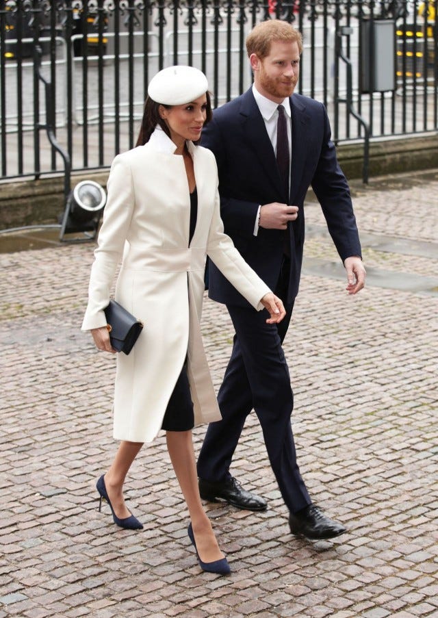 The 36-year-old humanitarian attended her first royal public event alongside Queen Elizabeth at the Commonwealth Service at Westminster Abbey on March 12. Meghan wowed in a cream-colored Amanda Wakeley coat with a white Stephen Jones hat and navy heels, completing the look with minimal makeup and her hair down in loose curls.