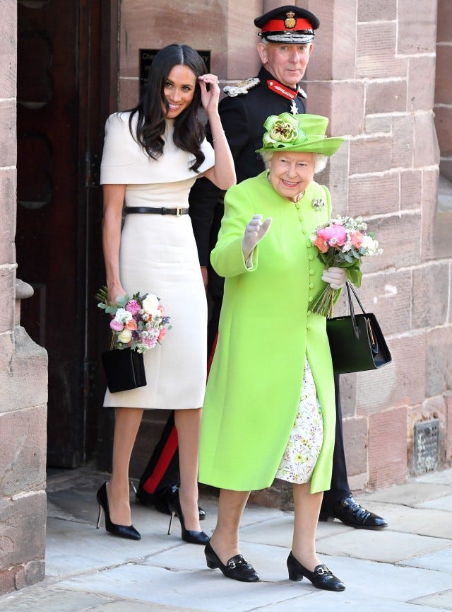 For her first solo appearance sans Prince Harry, Meghan accompanied Queen Elizabeth to Cheshire, England, on June 14 and all eyes were on the Duchess of Sussex as she stepped out in an elegant off-white dress with a statement shoulder overlay. The former Suits actress chose to not bare any shoulders this time, but the cape-like detail still added both interest and a fashion-forward vibe. A bespoke design by Clare Waight Keller of Givenchy, who created her now famous bateau neck wedding dress, the storied French brand is proving to become Meghan's go-to designer like Kate Middleton often enlists Sarah Burton of Alexander McQueen for her royal ensembles.
