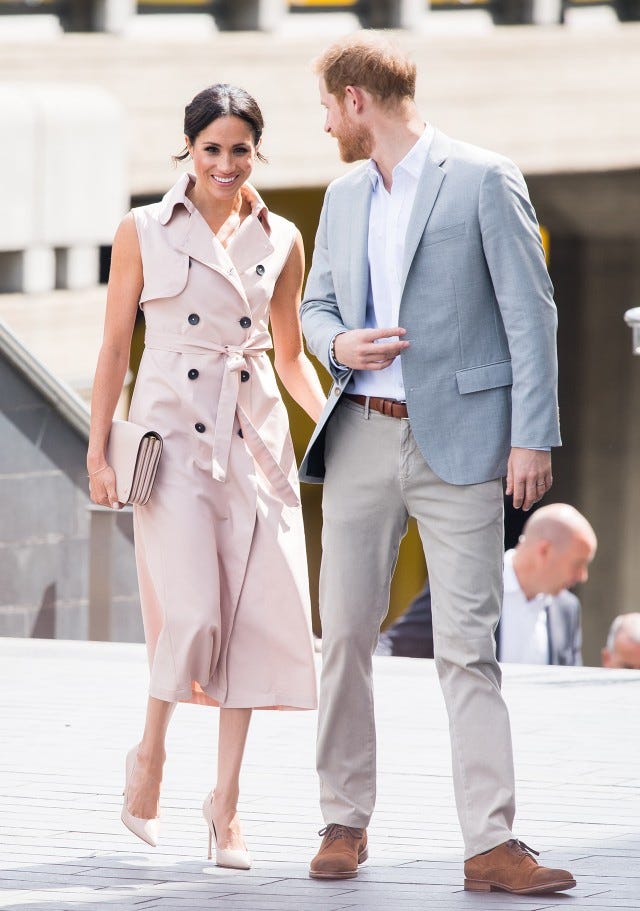 Meghan steps out in blush again! The Duchess of Sussex rewore a sleeveless pale pink trench dress by Canadian label NONIE while visiting the Nelson Mandela Centenary Exhibition with Prince Harry at the Queen Elizabeth Hall in London, England, on July 17. She opted for an elegant monochrome look by accessorizing with matching Dior pumps and Mulberry bag, complete with her go-to Birks white quartz stud earrings and a messy bun. The former actress shopped her own closet for the event, proving a timeless investment piece like the double-breasted frock can be donned for many occasions -- a sartorial move her sister-in-law, Kate Middleton, has become famous for. She has owned the piece for quite some time now, which she purchased in Toronto while she lived there filming Suits.