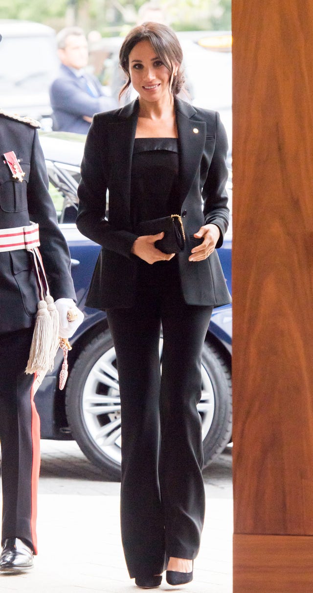 Chic menswear-inspired black outfits seem to be Meghan's favorite looks right now. Just days after surprising royal fans by wearing a tuxedo dress, the Duchess of Sussex attended the 2018 WellChild Awards in London on Sept. 4 with husband Prince Harry, a longtime supporter of the WellChild organization, where she donned an all-black ensemble that included an Altuzarra suit and a Deitas camisole blouse, as well as her signature low bun.