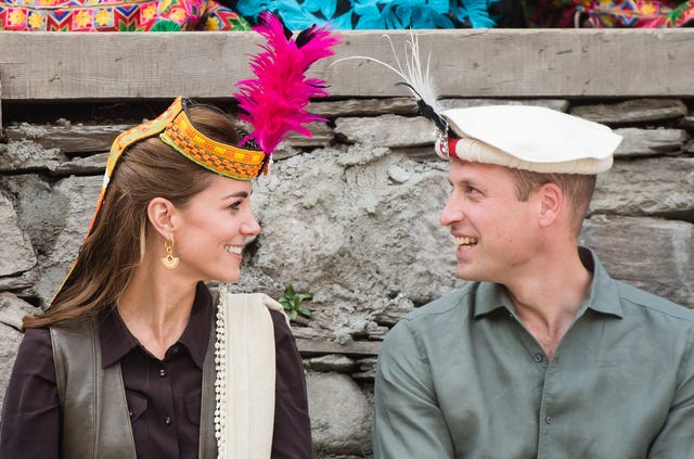 The Duke and Duchess of Cambridge inspected each other's traditional feathered headpieces while learning more about the Kalash people at a settlement in Chitral during their royal tour of Pakistan on Oct. 16.