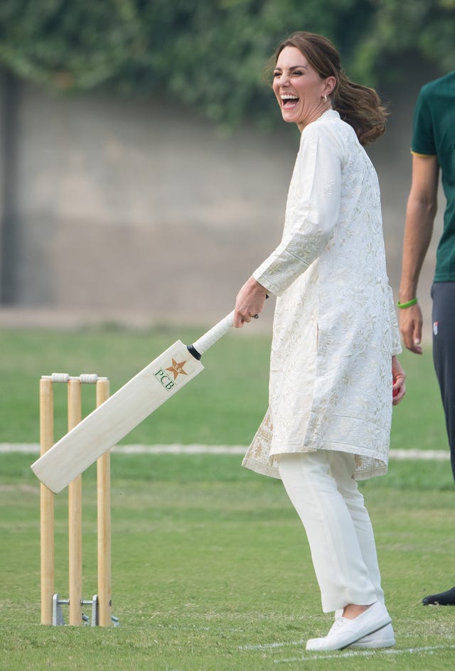 The royal mom of three tried her hand at cricket while visiting the National Cricket Academy in Lahore, Pakistan, on Oct. 17.
