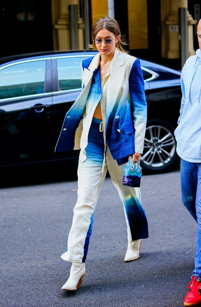 The model turned heads in a chic blue-and-white suit when out in New York on Oct. 19.