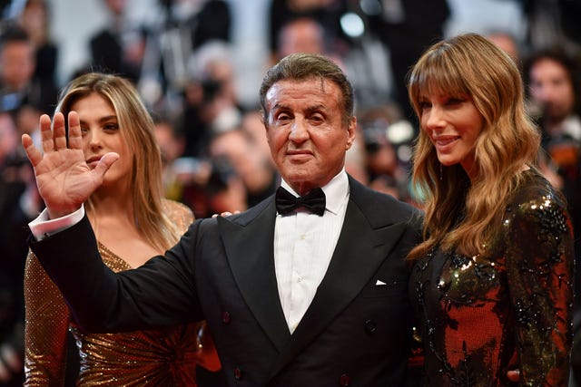 Flanked by daughter Sistine and wife Jennifer, the 72-year-old actor waved to photogs at the "Homage to Sylvester Stallone" screening of Rambo: First Blood.