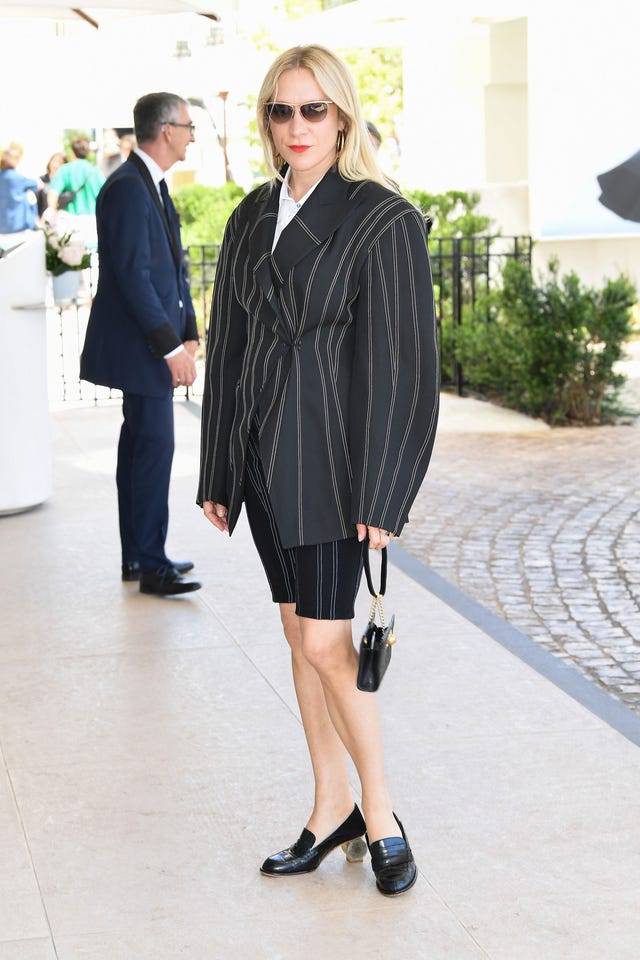 From the exaggerated shoulders to the skinny Bermuda shorts, leave it to the indie movie darling to put a unique spin on an '80s business suit.