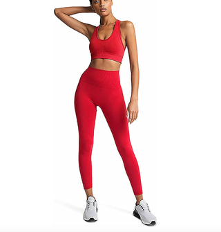 This tummy control legging and classic racerback sports bra is a steal. It comes in an array of trendy colors: fire engine red, earthy taupe, hunter green, deep coral, snakeskin print, and more.