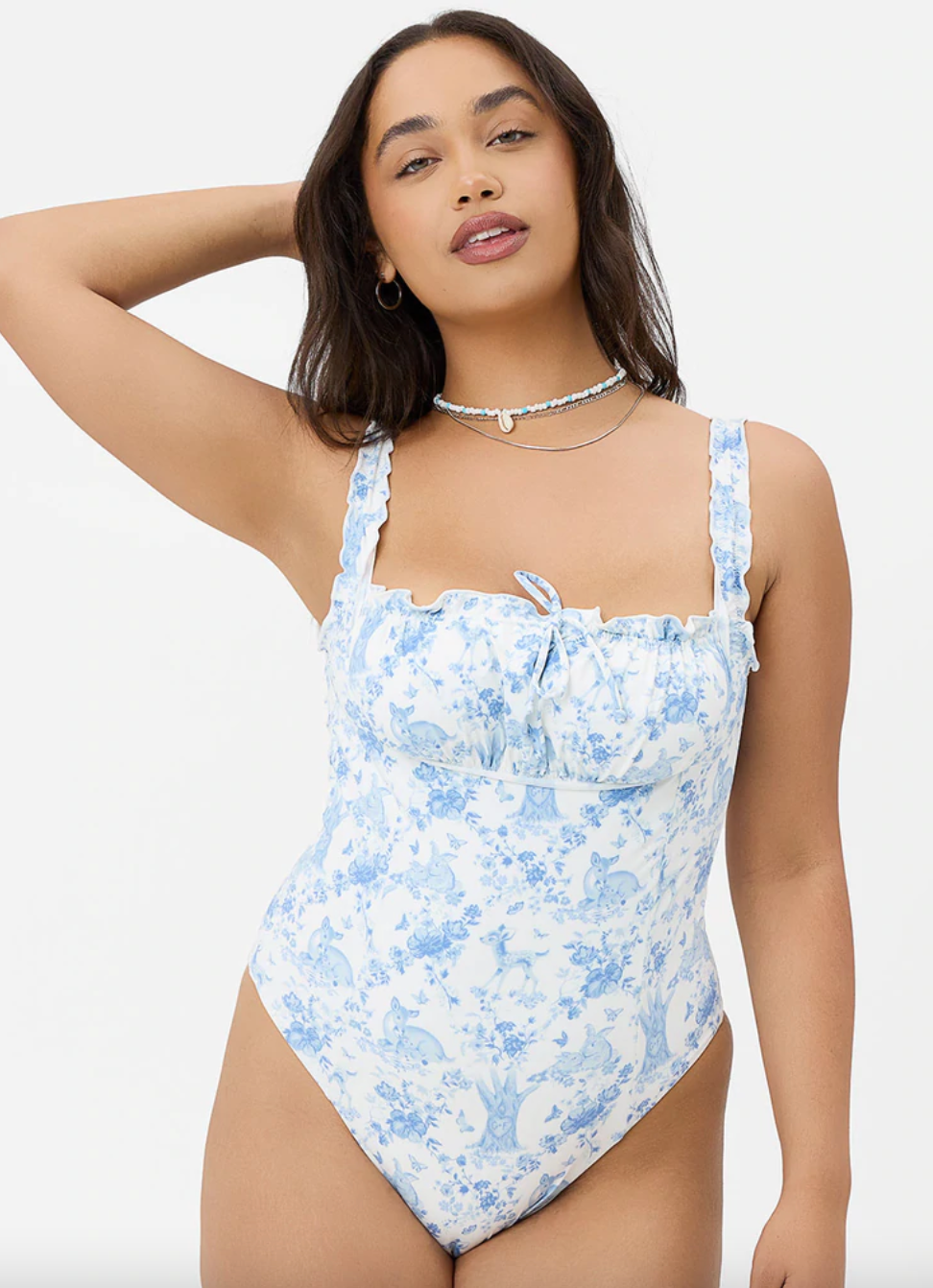 Score the dreamy white-and-blue one-piece swimsuit, featuring romantic details and a cottagecore-inspired print.