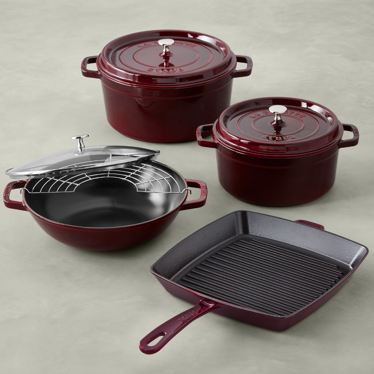 This seven-piece set comes with two sizes of round cocottes with lids, a grilling pan and Staub's Perfect Pan. Right now you can save over $700 on this extremely impressive cookware set.