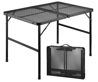 The aluminum mesh desktop of this table keeps messes to a minimum while providing a sturdy surface for grilling and serving food.