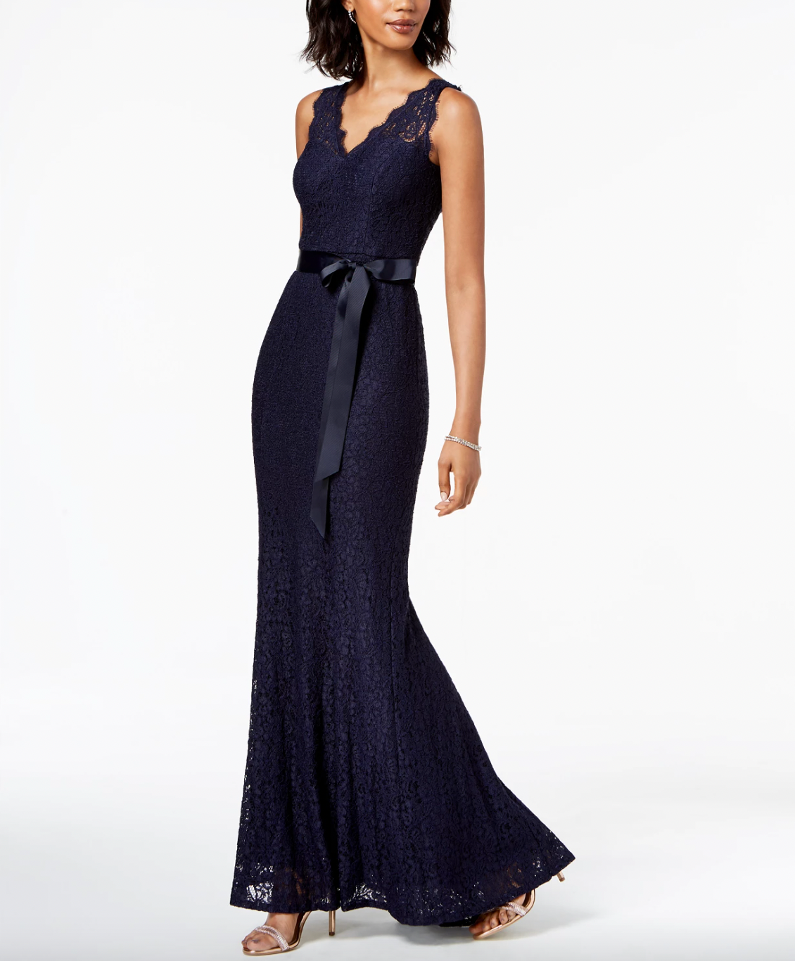 Keep it formal, fresh and black tie attire-friendly in this Lace V-Neck Satin Sash Gown from the beloved dress designer, Adrianna Papell.