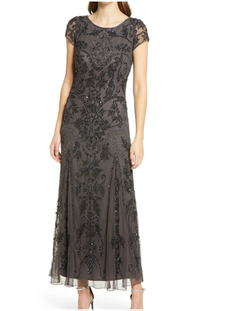 With beads and lace covering this ashy tulle dress, you'll be the best dressed guest at any occasion — especially a summer or winter ceremony.
