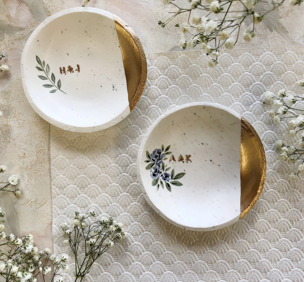 Help the bride-to-be keep her priceless wedding band safe with this dainty jewelry dish set from Etsy.