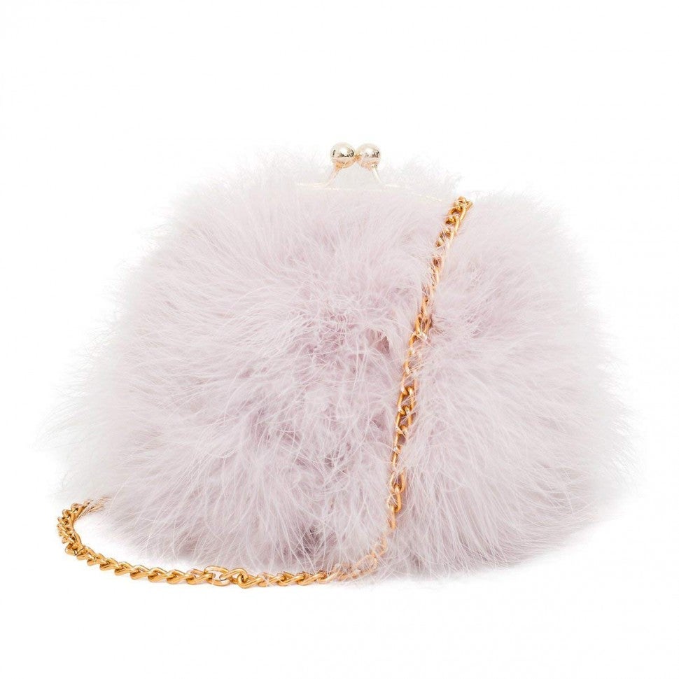Add a glamorous touch to a little black dress with a lilac marabou evening bag.