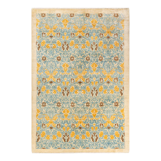 Score 50% off this hand-knotted, 100% wool rug in an eye-catching ivory, blue and yellow print.