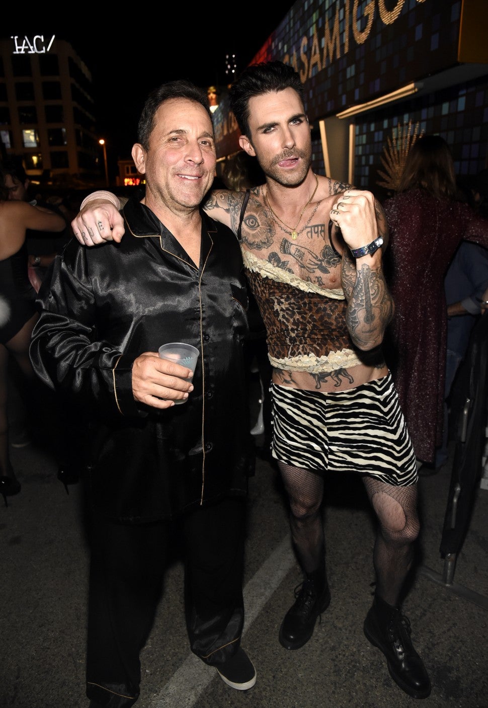 The Maroon 5 frontman wasn't afraid to show his feminine side at the annual Casamigos Halloween party on Friday. Levine, dressed like a sexy lady, paired a leopard-print camisole and zebra-print mini skirt with a cropped fur jacket, pastel pink wig and ripped fishnets.